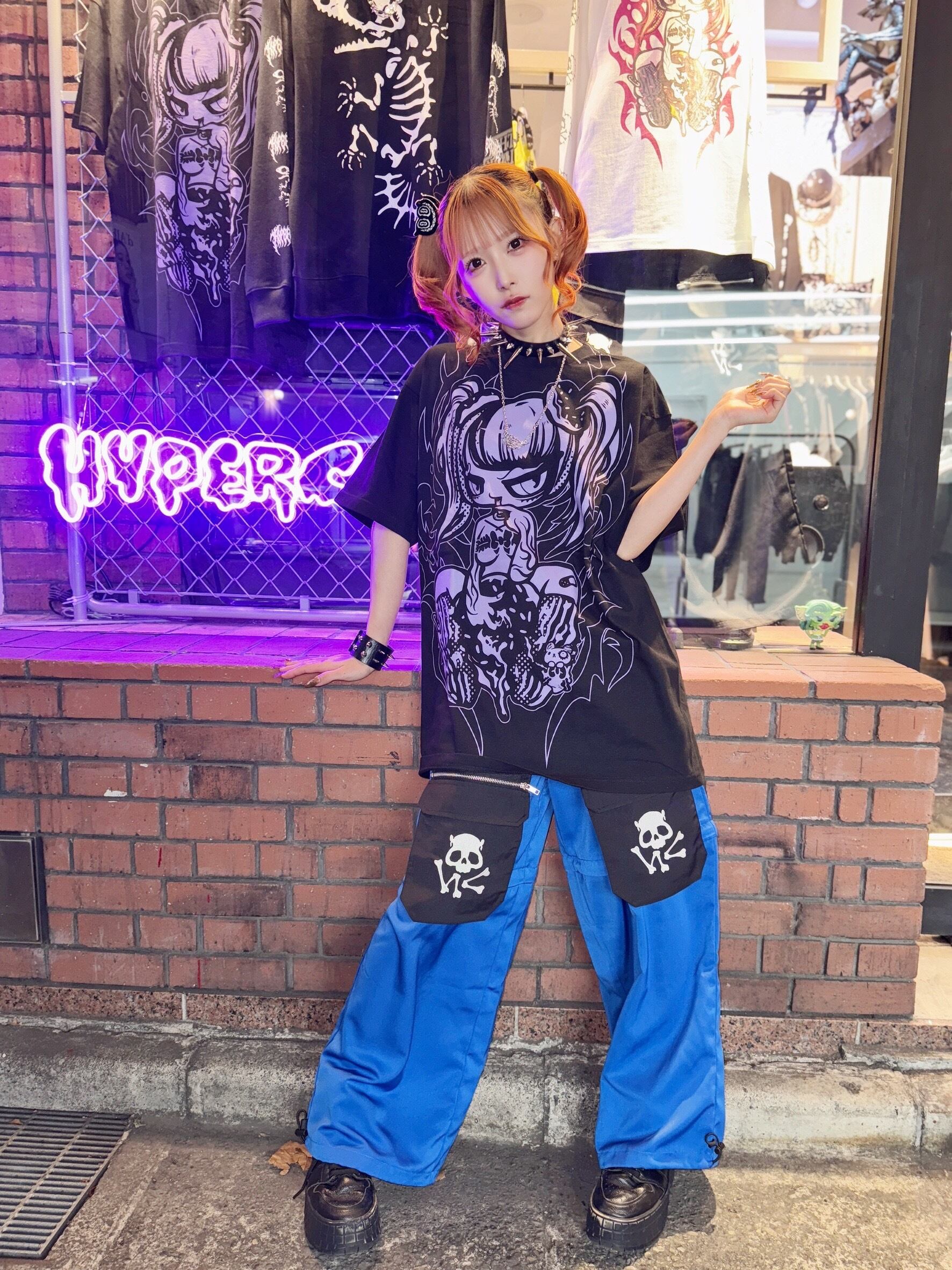 両サイドのHCスカルロゴ刺繍が目を惹くジップ多用のPUNKカーゴパンツです。