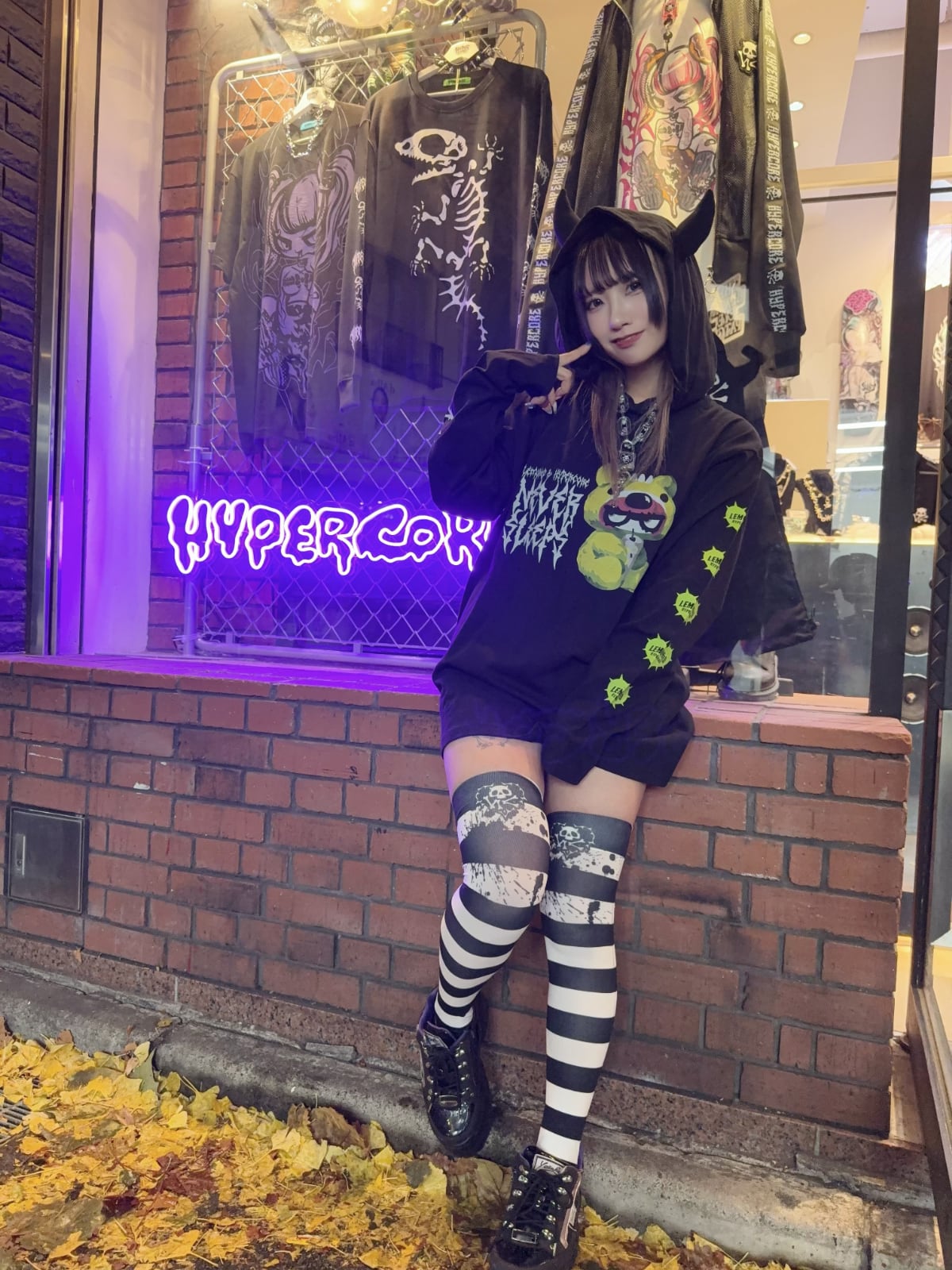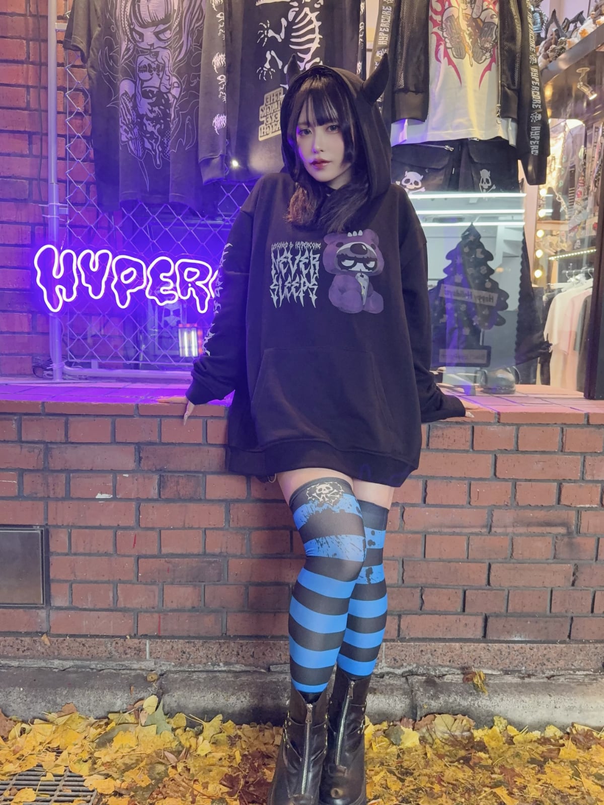 HC NEVER SLEEPSデザインのボーダー柄グラフィックニーハイです。