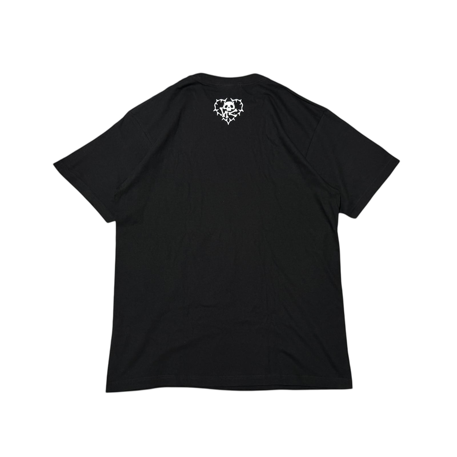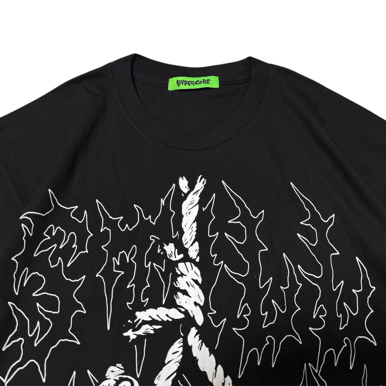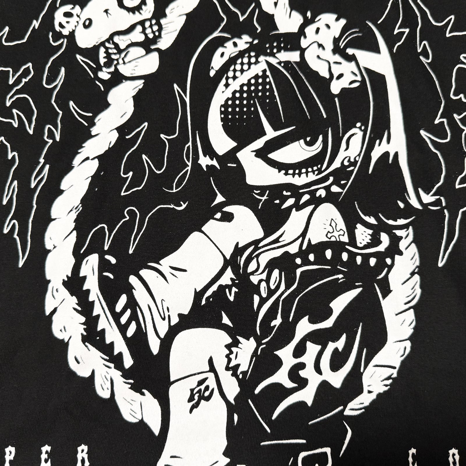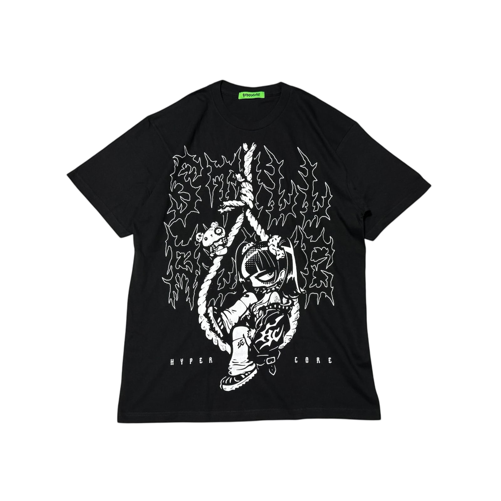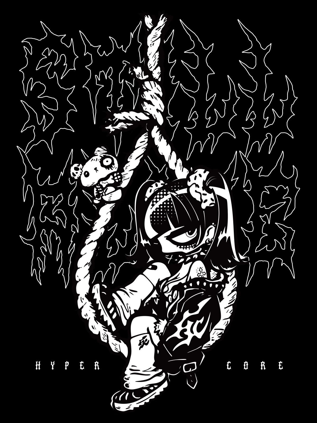 吊るされたロープにもたれかかった孤惡ちゃんが鋭い眼光で睨みつけたメッセージ性の強いTシャツです。