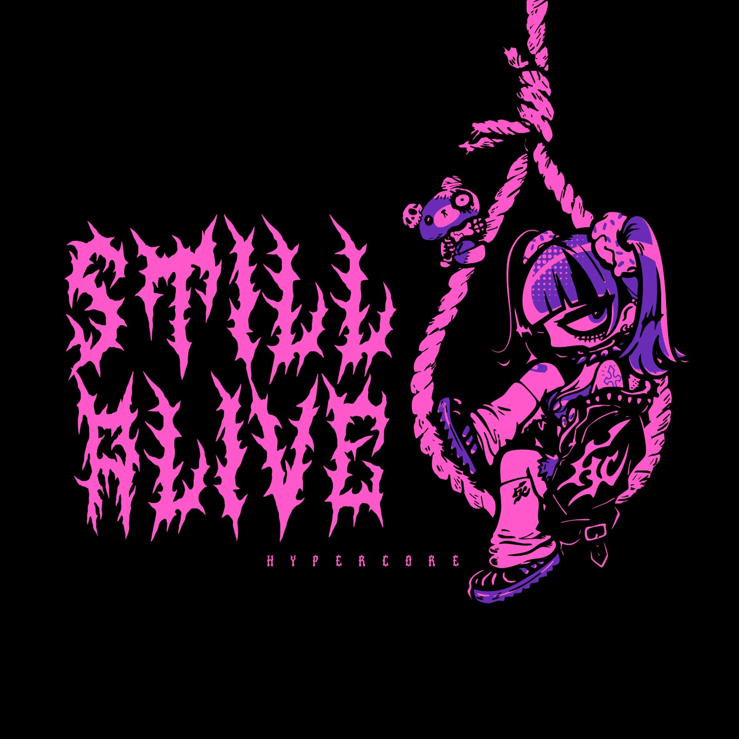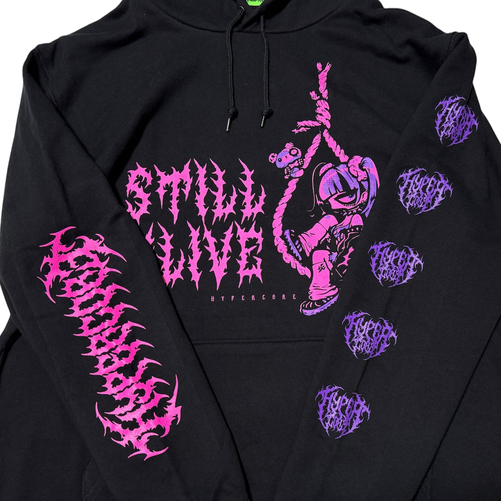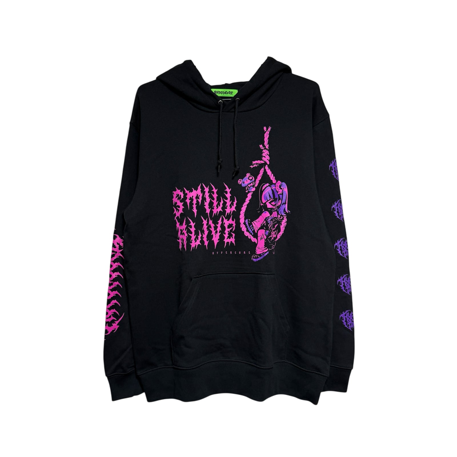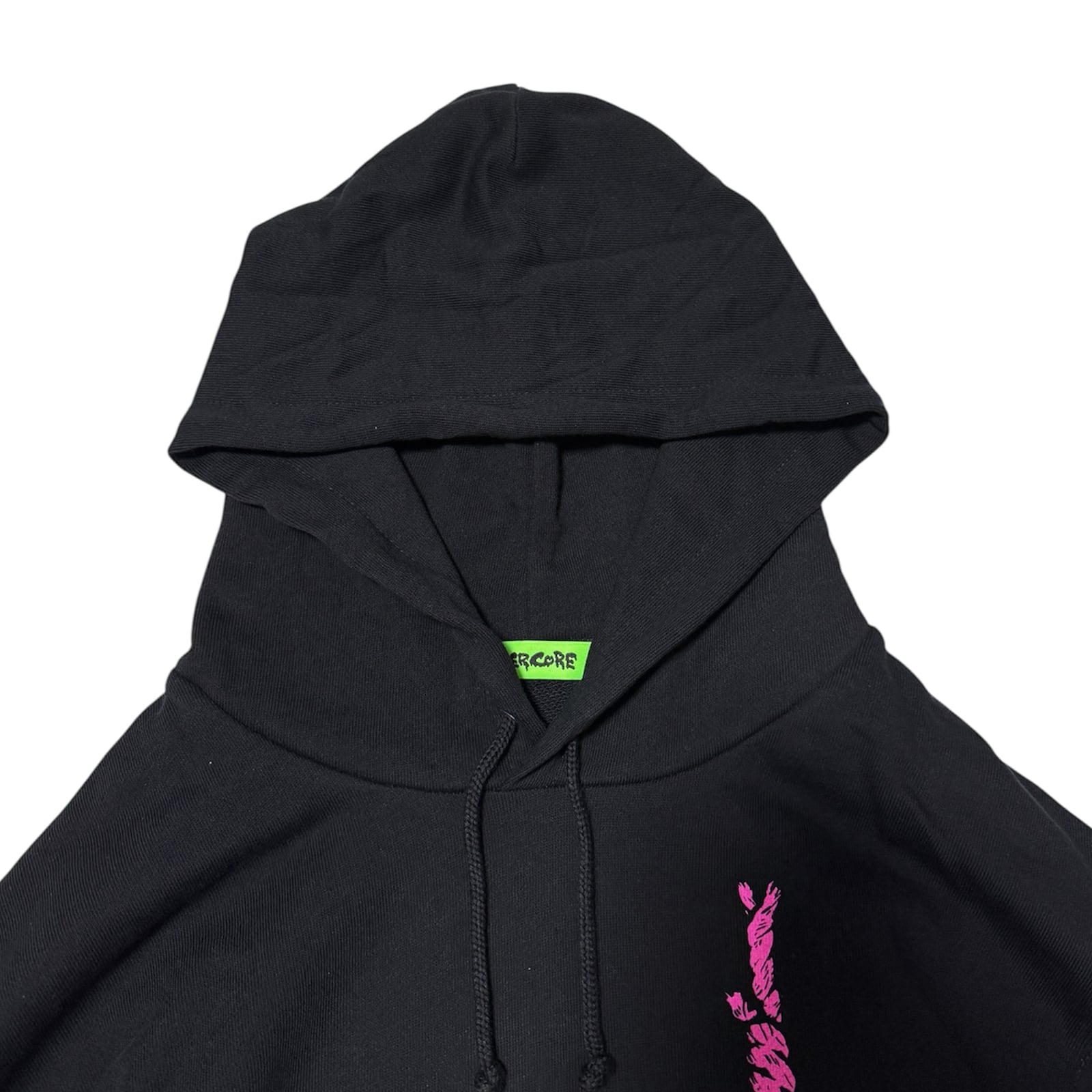 吊るされたロープにもたれかかった孤惡ちゃんが鋭い眼光で睨みつけたメッセージ性の強いフーディーです。