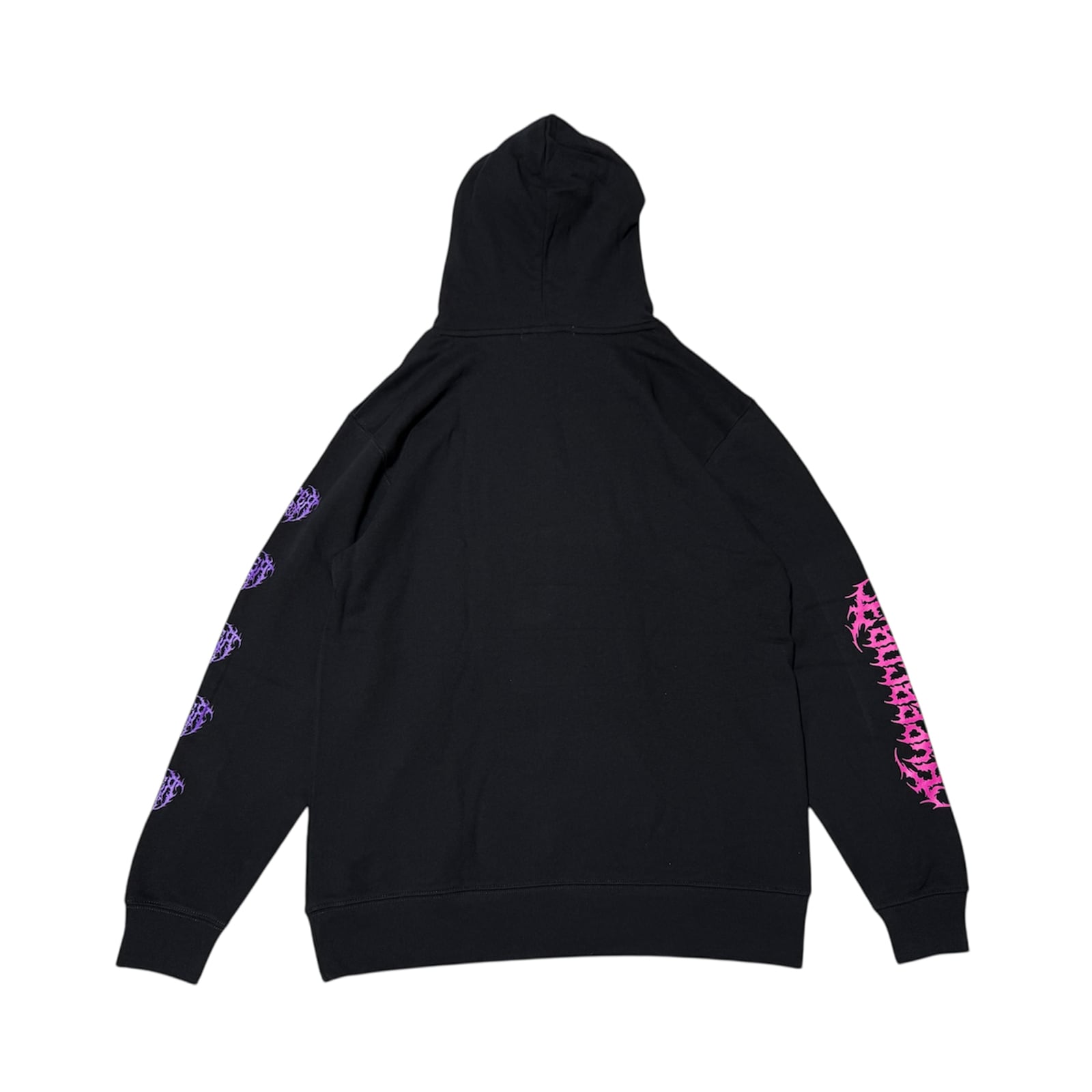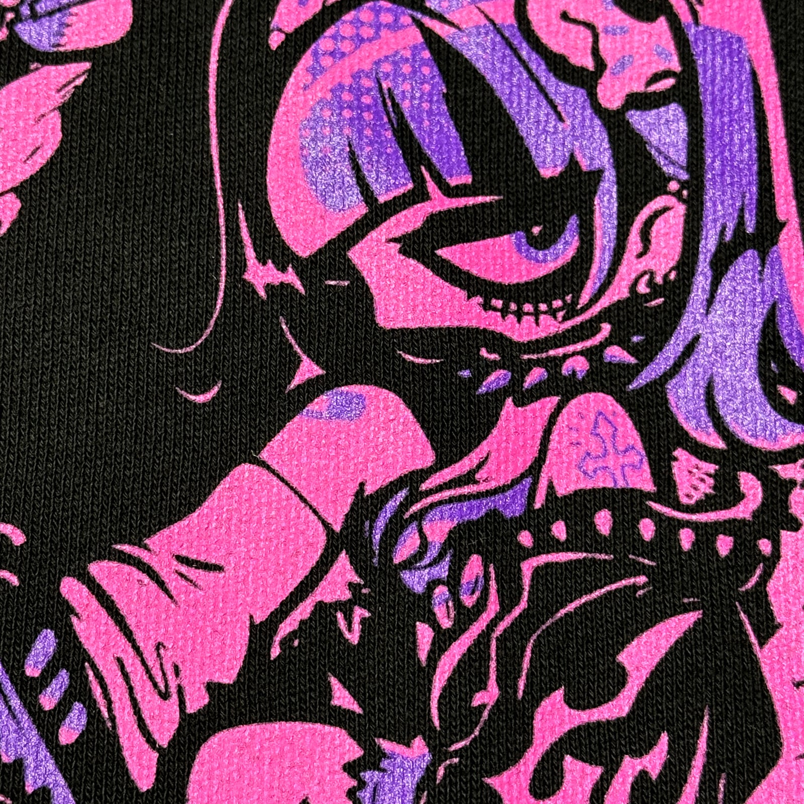 黒に映える鮮やかなピンクxパープルのプリントがPUNKな印象。