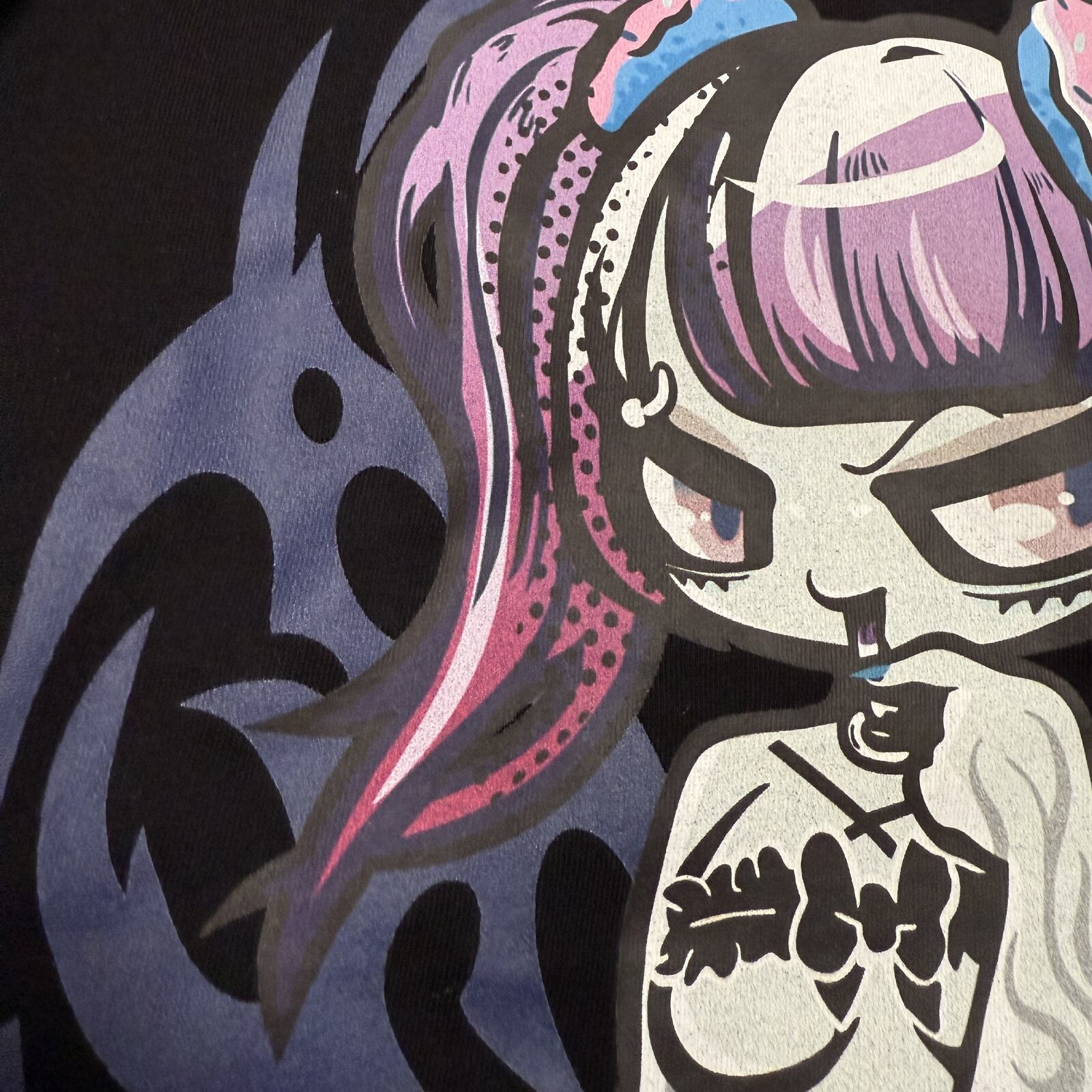 トライバル模様の袖プリント&ダメージ加工入りでパンキッシュな印象。